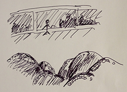 途中から、うす暗い紫色の風景を展望台から眺めている風景があった。