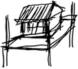花が咲きみだれ 南国 小さい オレンジ、エメラルドグリーンの家 海