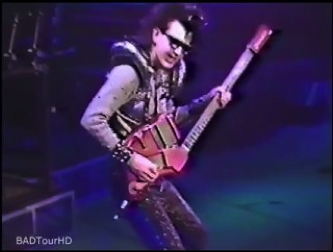 リハーサルの初日、私はシンタックスをストラップで固定していました。マイケルがやって来てそれを初めて見た時、彼の眼が頭から飛び出すのではないかと思いました!「ワオ!どこでそれを手に入れたんだい?」と彼は言いました。私は微笑みながら「自分なりの手段や方法があるんだ」と答えました。すぐに彼は、ジャクソンズのVictoryツアーの倉庫から未来的なギターを引っ張り出してきました。ジェニファーとジョンは礼儀上試してみましたが、演奏するのが難しいと丁寧に断りました。